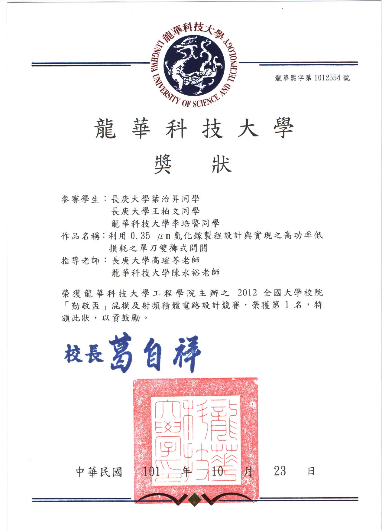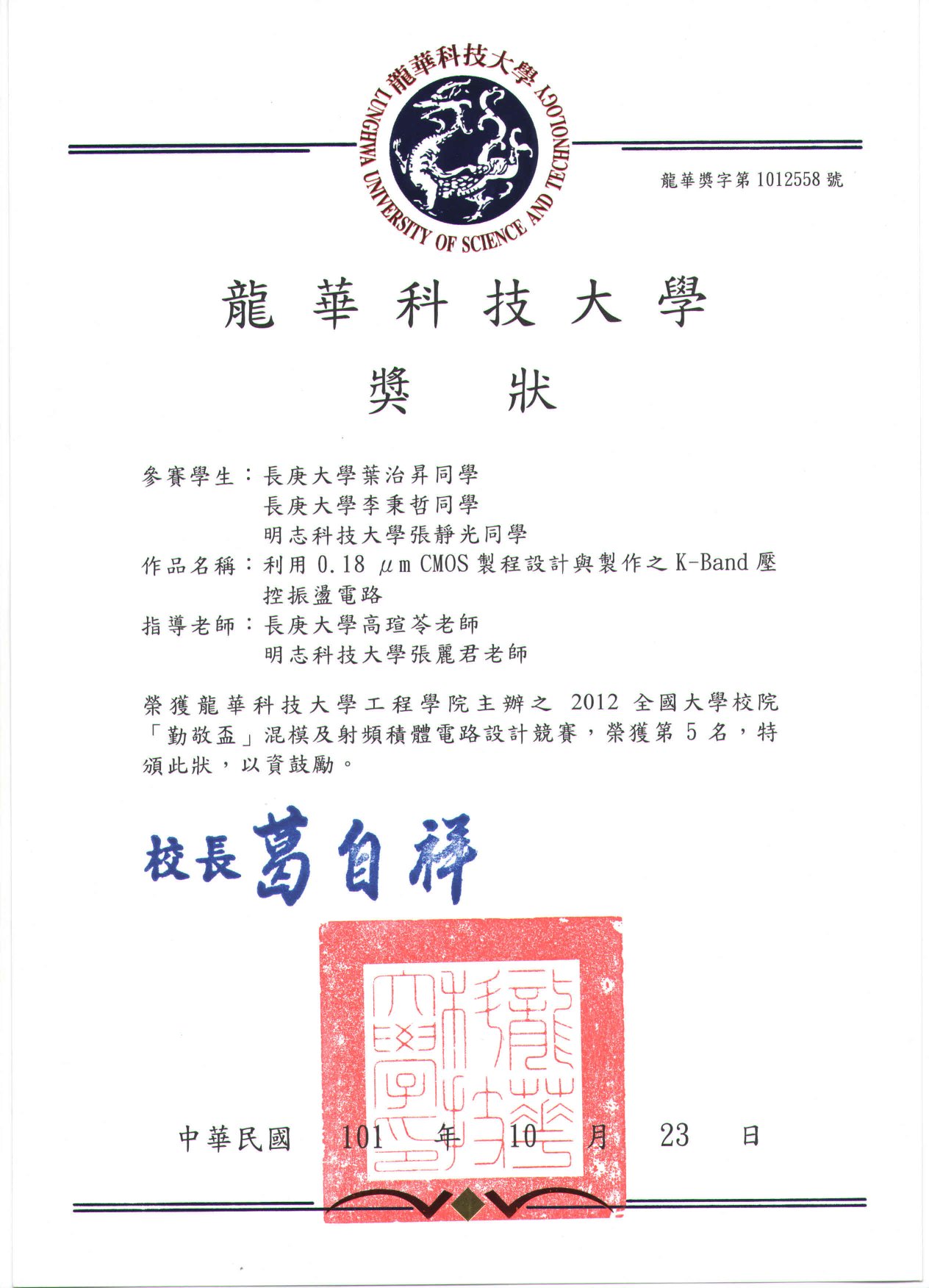 Congratulation!! 2012全國大學校院「勤敬盃」混模及射頻積體電路設計競賽榮獲得第一名與第五名