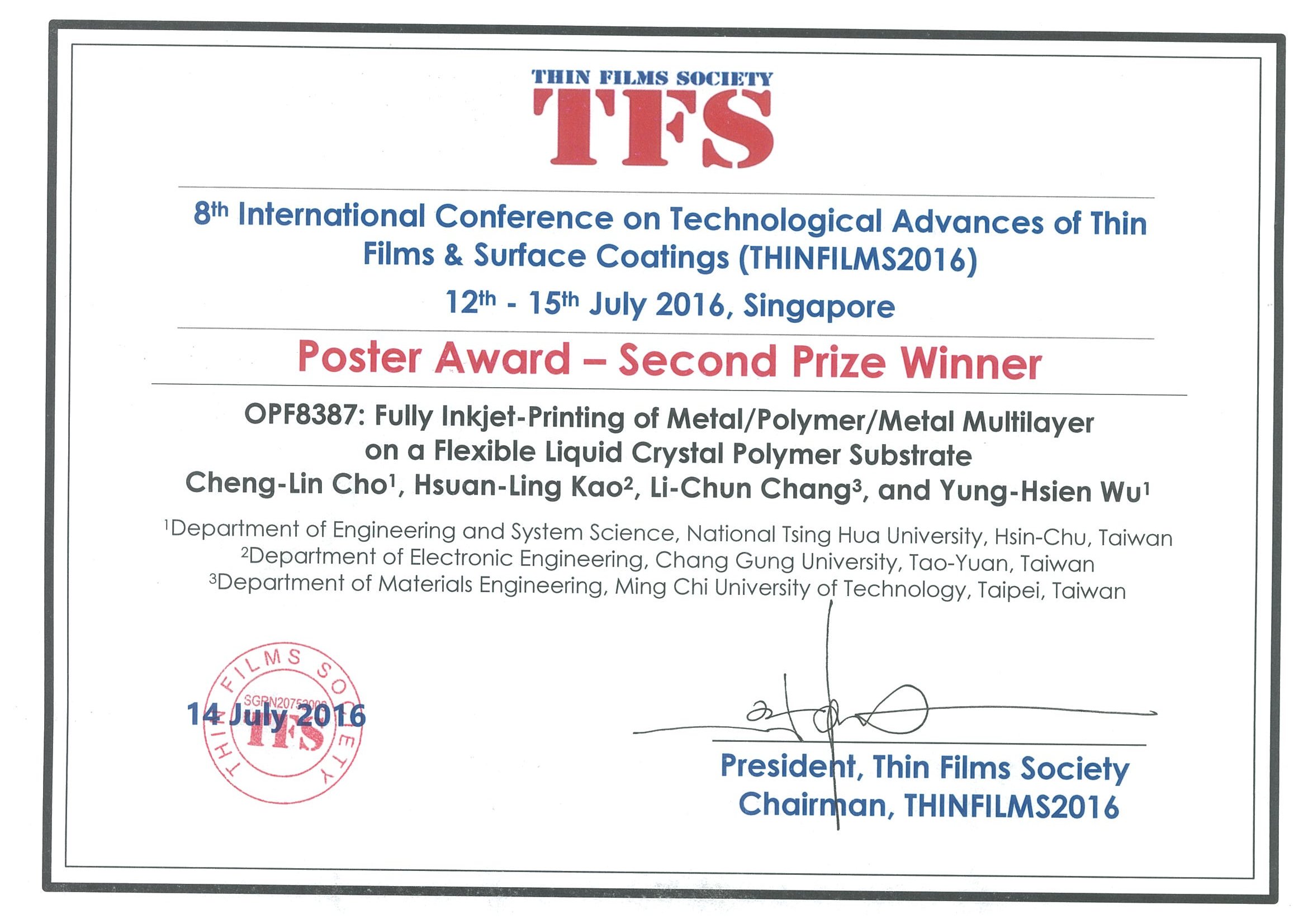 Cheng-Lin Cho, Hsuan-ling Kao*, Li-Chun Chang, and Yung-Hsien Wu, " Fully Inkjet-Printing of Metal/Polymer/Metal Multilayer on a Flexible Liquid Crystal Polymer Substrate" Thin Film Conference 2016.