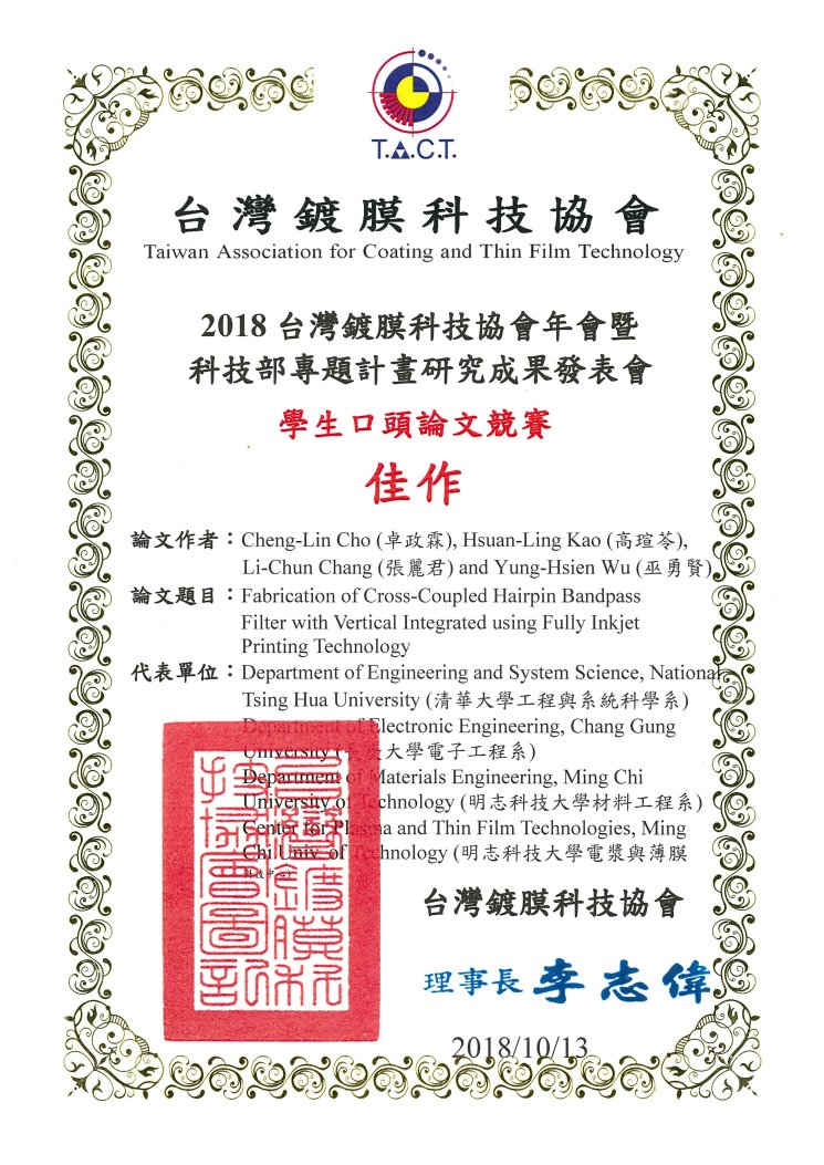 Cheng-Lin Cho (卓政霖), Hsuan-Ling Kao* (高瑄苓), Li-Chun Chang (張麗君), Yung-Hsien Wu (巫勇賢) "Fabrication of Cross-Coupled Hairpin Bandpass Filter with Vertical Integrated using Fully Inkjet Printing Technology" Thin Film Conference, 2018.