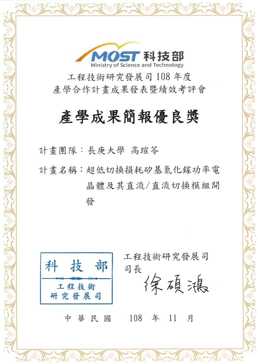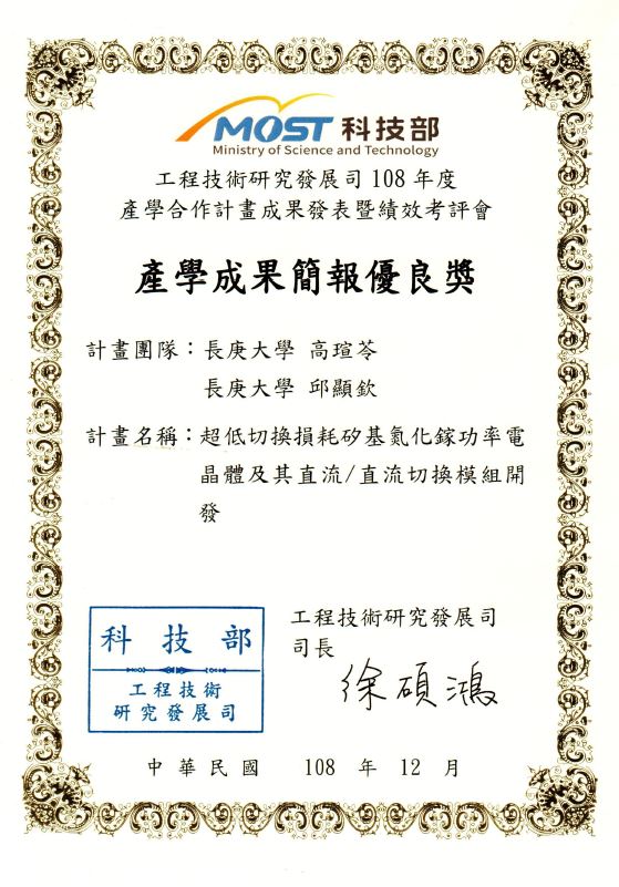 Congratulation!!本實驗室與邱顯欽教授實驗室共同執行科技部產學合作計畫"超低切換損耗矽基氮畫鎵功率電晶體及其直流/直流切換模組開發"獲得產學成果簡報優良獎