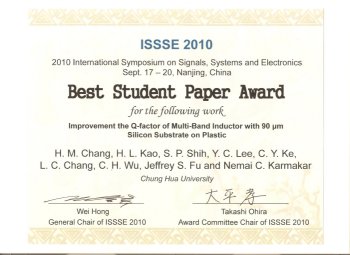 H. M. Chang, H. L. Kao, S. P. Shih, Y. C. Lee, C. Y. Ke, L. C. Chang, C. H. Wu,Jeffrey S. Fu, Nemai C. Karmakar "Improvement the Q-factor of Multi-Band Inductor with 90 um Silicon Substrate on Plastic," in International Symposium on Signals,Systems and Electronics (ISSSE), September 2010.
